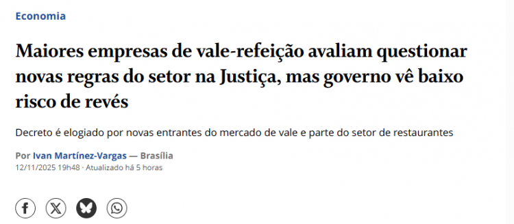 O novo decreto presidencial que redefine as regras do vale-refeição e vale-alimentação vem dividindo o setor. Enquanto as novas empresas do mercado elogiaram a medida, grandes operadoras estudam questionar o texto na Justiça. Já a Abrasel defende diálogo e equilíbrio, mas critica pontos específicos da norma.